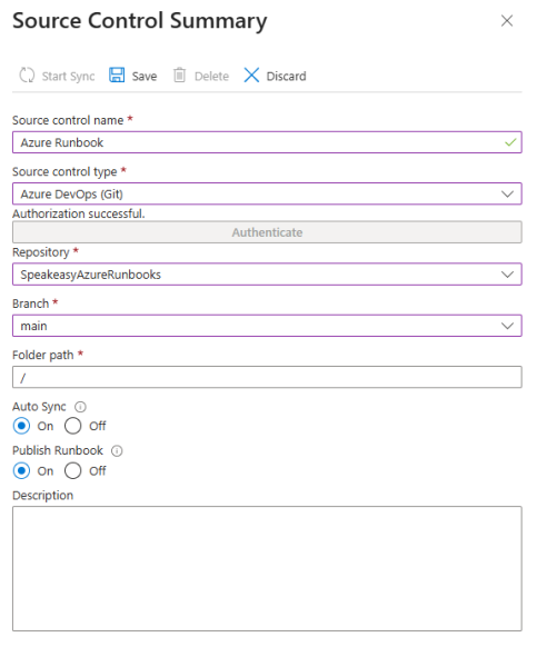 Occasionally, syncing stops – maybe the git credentials need to be renewed periodically. If this happens, simply click the “Authenticate” button in the source control configuration. The “Azure Runbook” configuration is shown below: